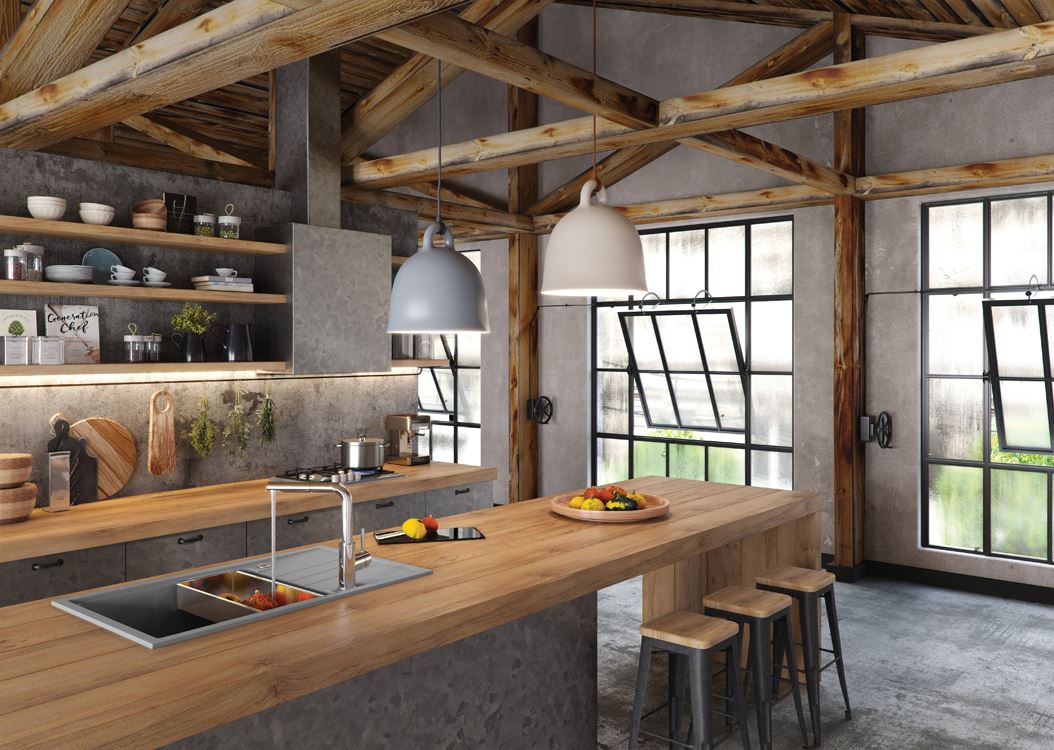 Załączone zdjęcie aranżacyjne przestawiają zlewozmywak Intermezzo 130 w kolorze 81 beton.