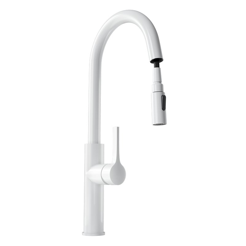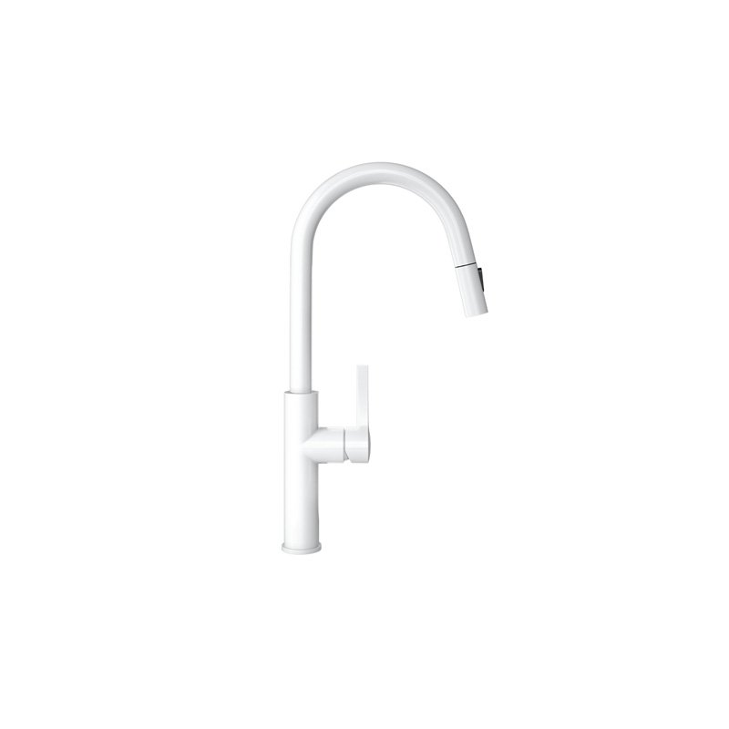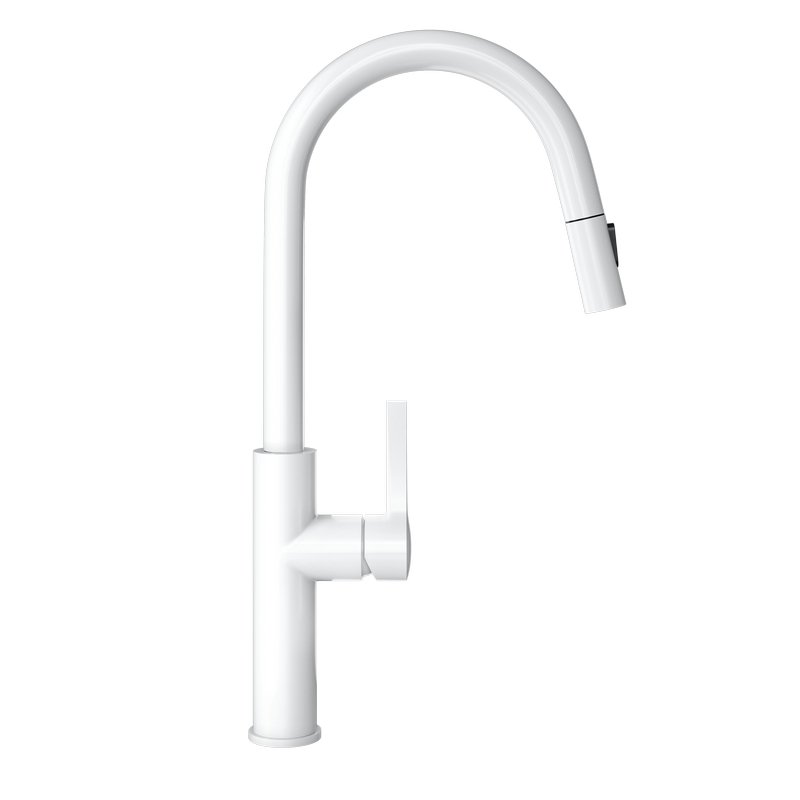 Krótki opis: bateria kuchenna z wyciąganą wylewką. Wykonanie: mosiądz. Uchwyt: stop cynku. Linia: DesignBiały bateria kuchenna z wyciąganą wylewkąBateria kuchenna Divio White zachwyca pięknym designem i funkcjonalnością. Została wykonana z dbałością o szczegóły, dlatego doskonale uzupełni kuchenną przestrzeń. Ogromną zaletą baterii jest wyciągana wylewka z solidnym mocowaniem, która pozwoli zadbać o najwyższy komfort zmywania. Elegancki, stylowy kształt i biały kolor sprawiają, że bateria znajdzie zastosowanie zarówno w nowoczesnych, jak i klasycznych kuchniach.Zestaw zawiera: bateria, wężyki, zestaw mocujący, uszczelki.Zalety i korzyści dla użytkownika Wygodna w użytkowaniu - Divio to bateria z wyciąganą wylewką. Dzięki tej funkcji możesz skierować strumień wody, tam gdzie tego potrzebujesz. Wygodnie umyjesz naczynia, sprzątniesz strefę wokół zlewu, czy napełnisz wysoki garnek wodą. Wyjątkowe wzornictwo - bateria zlewozmywakowa Divio jest wykończona w kolorze białym, dlatego będzie eleganckim akcentem w kuchni. Trwała konstrukcja - zastosowany do produkcji baterii mosiądz cechuje się wysoką odpornością, co pozwoli użytkować baterię przez długie lata. Malowanie metodą PVD zwiększa odporność na zarysowanie, dzięki czemu przy odpowiedniej pielęgnacji nawet po długim czasie bateria będzie prezentować się jak nowa.Przeznaczenie: Bateria przeznaczona jest do użytku ze zlewozmywakami kuchennymi. Może być również montowana bezpośrednio na blacie.Materiały: Bateria została wykonana z mosiądzu, na który naniesiona została powłoka PVD w kolorze białym. Uchwyt jest ze stopu cynku.ID#