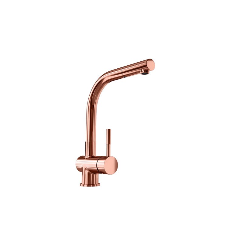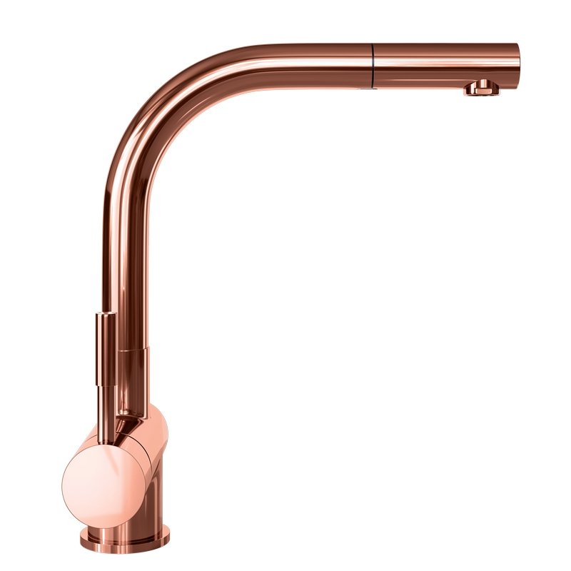Krótki opis: bateria kuchenna w wyciąganą wylewką. Wykonanie: mosiądz. Uchwyt: stop cynku. Linia: EXCLUSIVEMiedziana bateria z wyciąganą wylewkąBateria kuchenna Lobio Copper zachwyca pięknym designem i funkcjonalnością. Została wykonana z dbałością o szczegóły, dlatego doskonale uzupełni kuchenną przestrzeń. Ogromną zaletą baterii jest wyciągana wylewka z solidnym mocowaniem, która pozwoli zadbać o najwyższy komfort zmywania. Elegancki, stylowy kształt i kolor miedziany sprawiają, że bateria znajdzie zastosowanie zarówno w nowoczesnych, jak i klasycznych kuchniach.Zestaw zawiera: bateria, wężyki, zestaw mocujący, uszczelki.Zalety i korzyści dla użytkownika Wygodna w użytkowaniu - Lobio to bateria z wyciąganą wylewką. Dzięki tej funkcji możesz skierować strumień wody, tam gdzie tego potrzebujesz. Wygodnie umyjesz naczynia, sprzątniesz strefę wokół zlewu, czy napełnisz wysoki garnek wodą. Wyjątkowe wzornictwo - bateria zlewozmywakowa Lobio jest wykończona w kolorze miedzianym, dlatego będzie eleganckim akcentem w kuchni. Trwała konstrukcja - zastosowany do produkcji baterii mosiądz cechuje się wysoką odpornością, co pozwoli użytkować baterię przez długie lata. Malowanie metodą PVD zwiększa odporność na zarysowanie, dzięki czemu przy odpowiedniej pielęgnacji nawet po długim czasie bateria będzie prezentować się jak nowa.Przeznaczenie: Bateria przeznaczona jest do użytku ze zlewozmywakami kuchennymi. Może być również montowana bezpośrednio na blacie.Materiały: Bateria została wykonana z mosiądzu malowana metodą PVD na kolor miedziany.Dobrze wiedzieć!Bateria Lobio Copper będzie znakomicie prezentować się w towarzystwie złotego okapu GLOBALO w odcieniu Copper.ID#409