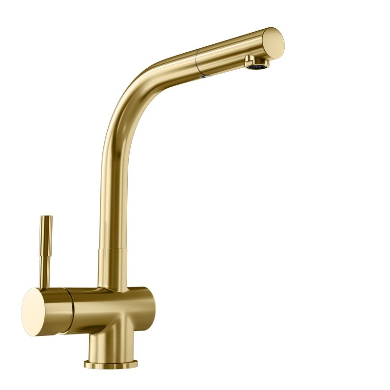 Krótki opis: bateria kuchenna w wyciąganą wylewką. Wykonanie: mosiądz. Uchwyt: stop cynku. Linia: EXCLUSIVEZłota bateria z wyciąganą wylewkąBateria kuchenna Lobio Gold Mat zachwyca pięknym designem i funkcjonalnością. Została wykonana z dbałością o szczegóły, dlatego doskonale uzupełni kuchenną przestrzeń. Ogromną zaletą baterii jest wyciągana wylewka z solidnym mocowaniem, która pozwoli zadbać o najwyższy komfort zmywania. Elegancki, stylowy kształt i kolor złoty sprawiają, że bateria znajdzie zastosowanie zarówno w nowoczesnych, jak i klasycznych kuchniach.Zestaw zawiera: bateria, wężyki, zestaw mocujący, uszczelki.Zalety i korzyści dla użytkownika Wygodna w użytkowaniu - Lobio to bateria z wyciąganą wylewką. Dzięki tej funkcji możesz skierować strumień wody, tam gdzie tego potrzebujesz. Wygodnie umyjesz naczynia, sprzątniesz strefę wokół zlewu, czy napełnisz wysoki garnek wodą. Wyjątkowe wzornictwo - bateria zlewozmywakowa Lobio jest wykończona w kolorze matowego złota, dlatego będzie eleganckim akcentem w kuchni. Trwała konstrukcja - zastosowany do produkcji baterii mosiądz cechuje się wysoką odpornością, co pozwoli użytkować baterię przez długie lata. Malowanie metodą PVD zwiększa odporność na zarysowanie, dzięki czemu przy odpowiedniej pielęgnacji nawet po długim czasie bateria będzie prezentować się jak nowa.Przeznaczenie: Bateria przeznaczona jest do użytku ze zlewozmywakami kuchennymi. Może być również montowana bezpośrednio na blacie.Materiały: Bateria została wykonana z mosiądzu malowana metodą PVD na kolor złoty mat.Dobrze wiedzieć!Bateria Lobio Gold Mat będzie znakomicie prezentować się w towarzystwie złotego okapu GLOBALO w odcieniu Gold Mat. ID#555