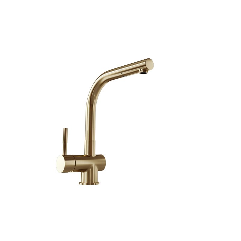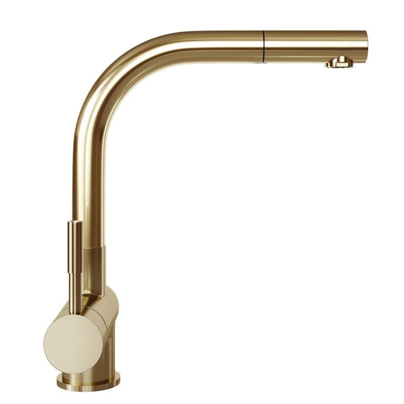 Krótki opis: bateria kuchenna w wyciąganą wylewką. Wykonanie: mosiądz. Uchwyt: stop cynku. Linia: EXCLUSIVEZłota bateria z wyciąganą wylewkąBateria kuchenna Lobio Light Gold Mat zachwyca pięknym designem i funkcjonalnością. Została wykonana z dbałością o szczegóły, dlatego doskonale uzupełni kuchenną przestrzeń. Ogromną zaletą baterii jest wyciągana wylewka z solidnym mocowaniem, która pozwoli zadbać o najwyższy komfort zmywania. Elegancki, stylowy kształt i kolor jasnego złota sprawiają, że bateria znajdzie zastosowanie zarówno w nowoczesnych, jak i klasycznych kuchniach.Zestaw zawiera: bateria, wężyki, zestaw mocujący, uszczelki.Zalety i korzyści dla użytkownika Wygodna w użytkowaniu - Lobio to bateria z wyciąganą wylewką. Dzięki tej funkcji możesz skierować strumień wody, tam gdzie tego potrzebujesz. Wygodnie umyjesz naczynia, sprzątniesz strefę wokół zlewu, czy napełnisz wysoki garnek wodą. Wyjątkowe wzornictwo - bateria zlewozmywakowa Lobio jest wykończona w kolorze złotym, dlatego będzie eleganckim akcentem w kuchni. Trwała konstrukcja - zastosowany do produkcji baterii mosiądz cechuje się wysoką odpornością, co pozwoli użytkować baterię przez długie lata. Malowanie metodą PVD zwiększa odporność na zarysowanie, dzięki czemu przy odpowiedniej pielęgnacji nawet po długim czasie bateria będzie prezentować się jak nowa.Przeznaczenie: Bateria przeznaczona jest do użytku ze zlewozmywakami kuchennymi. Może być również montowana bezpośrednio na blacie.Materiały: Bateria została wykonana z mosiądzu malowana metodą PVD na kolor jasnego złota.Dobrze wiedzieć!Bateria Lobio Light Gold Mat pasuje do okapów kuchennych GLOBALO w odcieniu Light Gold Mat:Cylindro Isola 39 Light Gold Mat,Heweno 39 Light Gold Mat ID#456