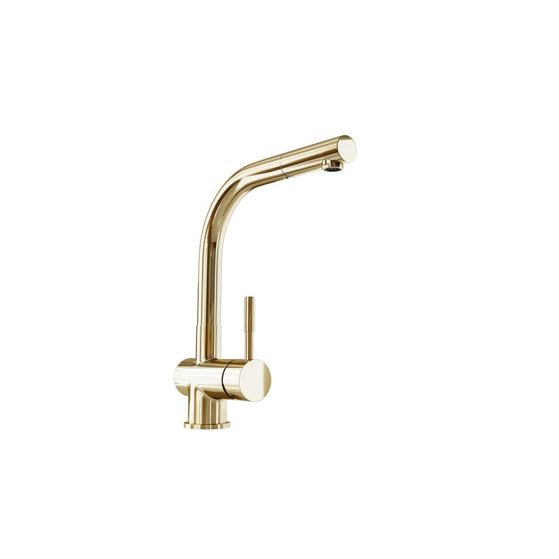 Krótki opis: bateria kuchenna w wyciąganą wylewką. Wykonanie: mosiądz. Uchwyt: stop cynku. Linia: EXCLUSIVEZłota bateria z wyciąganą wylewkąBateria kuchenna Lobio Light Gold zachwyca pięknym designem i funkcjonalnością. Została wykonana z dbałością o szczegóły, dlatego doskonale uzupełni kuchenną przestrzeń. Ogromną zaletą baterii jest wyciągana wylewka z solidnym mocowaniem, która pozwoli zadbać o najwyższy komfort zmywania. Elegancki, stylowy kształt i kolor jasnego złota sprawiają, że bateria znajdzie zastosowanie zarówno w nowoczesnych, jak i klasycznych kuchniach.Zestaw zawiera: bateria, wężyki, zestaw mocujący, uszczelki.Zalety i korzyści dla użytkownika Wygodna w użytkowaniu - Lobio to bateria z wyciąganą wylewką. Dzięki tej funkcji możesz skierować strumień wody, tam gdzie tego potrzebujesz. Wygodnie umyjesz naczynia, sprzątniesz strefę wokół zlewu, czy napełnisz wysoki garnek wodą. Wyjątkowe wzornictwo - bateria zlewozmywakowa Lobio jest wykończona w kolorze złotym, dlatego będzie eleganckim akcentem w kuchni. Trwała konstrukcja - zastosowany do produkcji baterii mosiądz cechuje się wysoką odpornością, co pozwoli użytkować baterię przez długie lata. Malowanie metodą PVD zwiększa odporność na zarysowanie, dzięki czemu przy odpowiedniej pielęgnacji nawet po długim czasie bateria będzie prezentować się jak nowa.Przeznaczenie: Bateria przeznaczona jest do użytku ze zlewozmywakami kuchennymi. Może być również montowana bezpośrednio na blacie.Materiały: Bateria została wykonana z mosiądzu malowana metodą PVD na kolor jasnego złota.Dobrze wiedzieć!Bateria Lobio Light Gold będzie znakomicie prezentować się w towarzystwie złotego okapu GLOBALO w odcieniu Light Gold.ID#407