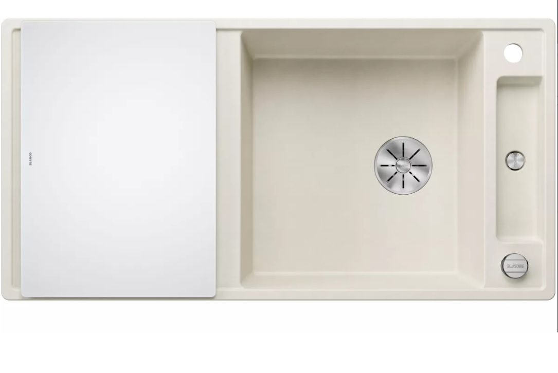 deska do krojenia z bezpiecznego szkła, armatura przelewowo-odpływowa zapewniająca więcej miejsca w szafce, korek z sitkiem 3 ½'’ InFino ze sterowaniem korkiem automatycznym (pokrętło)