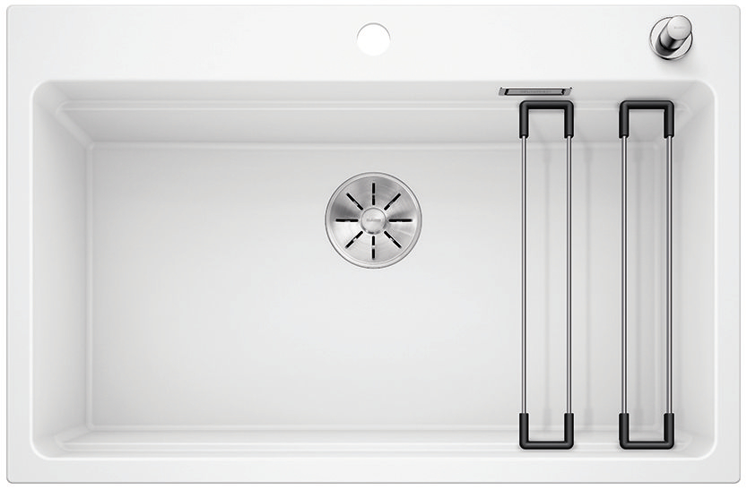 BLANCO ETAGON to wyjątkowy zlewozmywak posiadający wewnątrz komory wyprofilowaną krawędź, na której można oprzeć bardzo stabilne szyny ze stali szlachetnej. Na takich szynach postawimy np. pojemniki, garnki lub patelnie. Warzywa pokrojone na desce do krojenia, opartej na krawędzi komory, łatwo zsuniemy bezpośrednio do naczynia ustawionego na szynach w komorze. Dzięki temu zyskujemy dodatkowy funkcjonalny poziom, a zwykła pojedyncza komora staje się samowystarczalnym centrum kuchennym. Do tego modelu zlewozmywaka można dobrać praktyczną narożną odsączarkę, przenośny ociekacz i deskę do krojenia, która po zakryciu nią komory będzie stanowiła przedłużenie zlewozmywaka. BLANCO Etagon jest dostępny w wielu wariantach kolorystycznych w opcji z Silgranitu, a także w 4 kolorach w ceramice oraz w wersji ze stali szlachetnej.