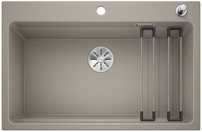 BLANCO ETAGON to wyjątkowy zlewozmywak posiadający wewnątrz komory wyprofilowaną krawędź, na której można oprzeć bardzo stabilne szyny ze stali szlachetnej. Na takich szynach postawimy np. pojemniki, garnki lub patelnie. Warzywa pokrojone na desce do krojenia, opartej na krawędzi komory, łatwo zsuniemy bezpośrednio do naczynia ustawionego na szynach w komorze. Dzięki temu zyskujemy dodatkowy funkcjonalny poziom, a zwykła pojedyncza komora staje się samowystarczalnym centrum kuchennym. Do tego modelu zlewozmywaka można dobrać praktyczną narożną odsączarkę, przenośny ociekacz i deskę do krojenia, która po zakryciu nią komory będzie stanowiła przedłużenie zlewozmywaka. BLANCO Etagon jest dostępny w wielu wariantach kolorystycznych w opcji z Silgranitu, a także w 4 kolorach w ceramice oraz w wersji ze stali szlachetnej.
