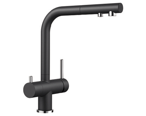 woda filtrowana i niefiltrowana z jednej wylewki z osobnymi kanałami przepływu. Posiada oddzielną dźwignię z prawej strony do wody mieszanej (ciepłej i zimnej ) oraz dźwignię do wody filtrowanej z lewej strony. Wymaga tylko jednego otworu 35 mm do zamocowania baterii, dzięki czemu mamy rozbudowany system dostarczania wody i zaoszczędzamy miejsce. Wyciągana wylewka ułatwia napełnianie naczyń.