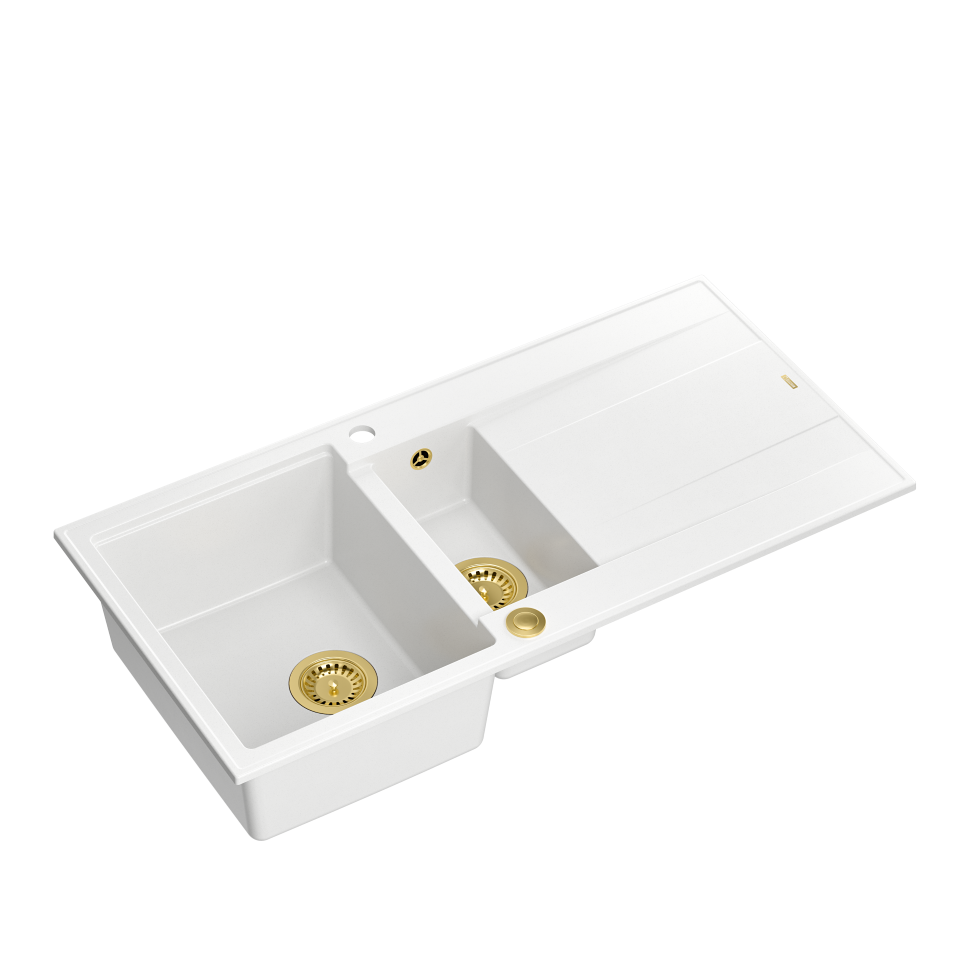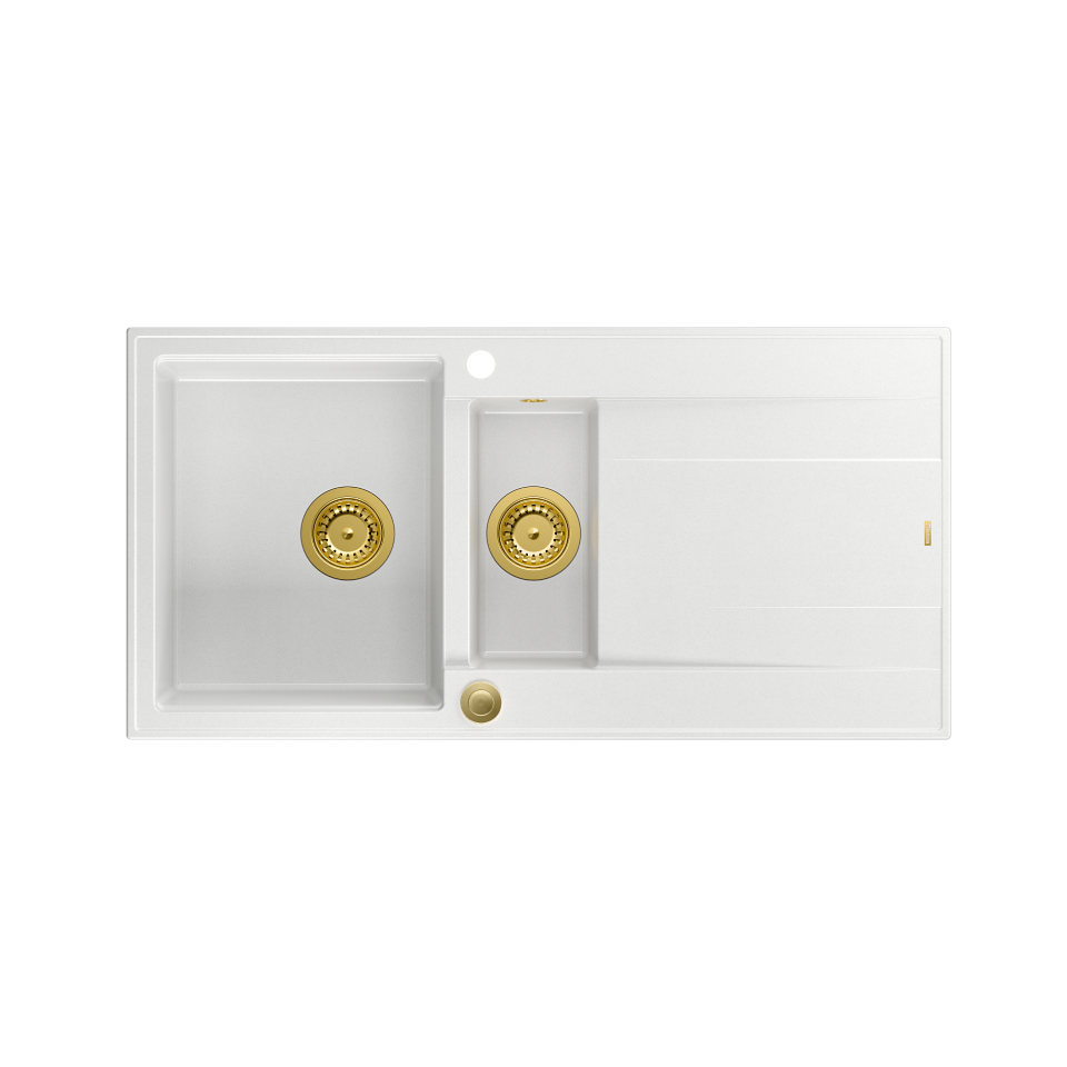 Strona główna » QUADRON » EVAN 156 GraniteQ zlewozmywak z syfonem Push To Open 2-komorowy z/o (1000x500x210; kom. 420x480) snow white / elementy złote