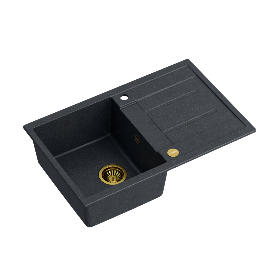 MORGAN 111 GraniteQ black diamond/elementy złote Zlewozmywak wykonany z GraniteQ gwarantuje najwyższą higieniczność i trwałość . Nowoczesne wzornictwo – dostosowane do aktualnych trendów. GraniteQ – zapewnia dużą twardość, trwałość i higieniczność powierzchni Zlewozmywak odwracalny – komora może być zamontowana po prawej lub lewej stronie. Rozetka przelewu również wykonana jest ze stali szlachetnej SteelQ w technologii PVD w kolorze dopasowanym do koloru pozostałych elementów co jeszcze bardziej podkreśla jego urodę. Zlewozmywak wyposażony jest w odpływ ze stali szlachetnej SteelQ w technologii PVD w kolorze dopasowanym do pozostałych elementów co nadaje produktowi elegancki wygląd oraz w syfon z możliwością podłączenia zmywarki lub pralki Głębokie i pojemne komory zlewozmywaków Quadron to ich cecha wyróżniająca, która zapewnia duży komfort użytkowania. Łatwy montaż - w komplecie zaczepy mocujące Wersja Premium Głębokie komory zlewozmywaków Quadron to ich cecha wyróżniająca. Pojemna komora to przede wszystkim duży komfort użytkowania. Zmywanie dużych garnków czy blach nie stanowi problemu dzięki temu, że pojemność zlewozmywaka jest zwiększona o kilka litrów. Zlewozmywak wyposażony jest w odpływ ze stali szlachetnej SteelQ w technologii PVD w wybranym kolorze co nadaje mu elegancki wygląd. GraniteQ - wygląd & trwałość Produkty wykonane z GraniteQ zapewniają nowoczesny wygląd i długowieczność produktu. Są łatwe do utrzymania w czystości, odporne na wysokie temperatury (gorące garnki) oraz tak częste w kuchni nagłe jej zmiany (wrząca i zimna woda), odporne na działanie czynników chemicznych oraz wiele rodzajów osadów (np. po kawie czy herbacie). GraniteQ – wytrzymałość & higiena Materiał GraniteQ stworzony jest z drobnych cząsteczek granitu (75-80%) połączonych ze sobą za pomocą wysokiej jakości spoiwa (20-25%), dzięki czemu zlewozmywak charakteryzuje się wyjątkową wytrzymałością i odpornością. Zastosowanie bardzo drobnych cząsteczek granitu minimalizuje przestrzeń wypełnioną spoiwem, dzięki czemu udało się uzyskać zlewozmywak jedwabiście gładki i delikatny w dotyku, co również ma ogromne znaczenie podczas czyszczenia i konserwacji, ale przede wszystkim dla higieny i zachowania czystości. GraniteQ – metaliczny blask GraniteQ to nowoczesny materiał w opalizujących kolorach uzyskanych dzięki domieszce metalicznych drobinek. Nawet najbardziej wymagający użytkownicy będą usatysfakcjonowani gdy światło z oświetlenia umieszczonego nad blatem sprawi, iż kuchnia zabłyszczy delikatnym połyskiem swojej nowej biżuterii: zlewozmywaka marki Quadron. Efekt ten zostanie spotęgowany dzięki dodaniu baterii, odpływu i przelewu wykonanych ze stali szlachetnej SteelQ w technologii PVD w kolorach złota lub miedzi.