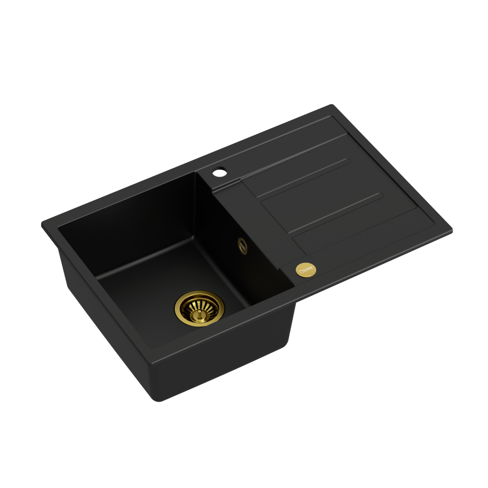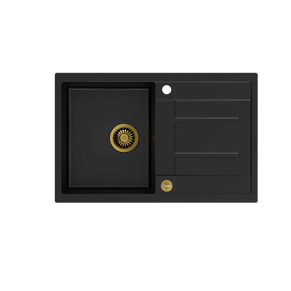 MORGAN 111 GraniteQ pure carbon/elementy złote Zlewozmywak wykonany z GraniteQ gwarantuje najwyższą higieniczność i trwałość . Nowoczesne wzornictwo – dostosowane do aktualnych trendów. GraniteQ – zapewnia dużą twardość, trwałość i higieniczność powierzchni Zlewozmywak odwracalny – komora może być zamontowana po prawej lub lewej stronie. Rozetka przelewu również wykonana jest ze stali szlachetnej SteelQ w technologii PVD w kolorze dopasowanym do koloru pozostałych elementów co jeszcze bardziej podkreśla jego urodę. Zlewozmywak wyposażony jest w odpływ ze stali szlachetnej SteelQ w technologii PVD w kolorze dopasowanym do pozostałych elementów co nadaje produktowi elegancki wygląd oraz w syfon z możliwością podłączenia zmywarki lub pralki Głębokie i pojemne komory zlewozmywaków Quadron to ich cecha wyróżniająca, która zapewnia duży komfort użytkowania. Łatwy montaż - w komplecie zaczepy mocujące Wersja Premium Głębokie komory zlewozmywaków Quadron to ich cecha wyróżniająca. Pojemna komora to przede wszystkim duży komfort użytkowania. Zmywanie dużych garnków czy blach nie stanowi problemu dzięki temu, że pojemność zlewozmywaka jest zwiększona o kilka litrów. Zlewozmywak wyposażony jest w odpływ ze stali szlachetnej SteelQ w technologii PVD w wybranym kolorze co nadaje mu elegancki wygląd. GraniteQ - wygląd & trwałość Produkty wykonane z GraniteQ zapewniają nowoczesny wygląd i długowieczność produktu. Są łatwe do utrzymania w czystości, odporne na wysokie temperatury (gorące garnki) oraz tak częste w kuchni nagłe jej zmiany (wrząca i zimna woda), odporne na działanie czynników chemicznych oraz wiele rodzajów osadów (np. po kawie czy herbacie). GraniteQ – wytrzymałość & higiena Materiał GraniteQ stworzony jest z drobnych cząsteczek granitu (75-80%) połączonych ze sobą za pomocą wysokiej jakości spoiwa (20-25%), dzięki czemu zlewozmywak charakteryzuje się wyjątkową wytrzymałością i odpornością. Zastosowanie bardzo drobnych cząsteczek granitu minimalizuje przestrzeń wypełnioną spoiwem, dzięki czemu udało się uzyskać zlewozmywak jedwabiście gładki i delikatny w dotyku, co również ma ogromne znaczenie podczas czyszczenia i konserwacji, ale przede wszystkim dla higieny i zachowania czystości. GraniteQ – metaliczny blask GraniteQ to nowoczesny materiał w opalizujących kolorach uzyskanych dzięki domieszce metalicznych drobinek. Nawet najbardziej wymagający użytkownicy będą usatysfakcjonowani gdy światło z oświetlenia umieszczonego nad blatem sprawi, iż kuchnia zabłyszczy delikatnym połyskiem swojej nowej biżuterii: zlewozmywaka marki Quadron. Efekt ten zostanie spotęgowany dzięki dodaniu baterii, odpływu i przelewu wykonanych ze stali szlachetnej SteelQ w technologii PVD w kolorach złota lub miedzi.
