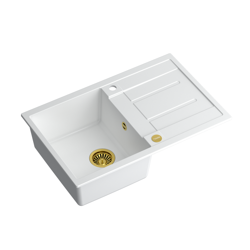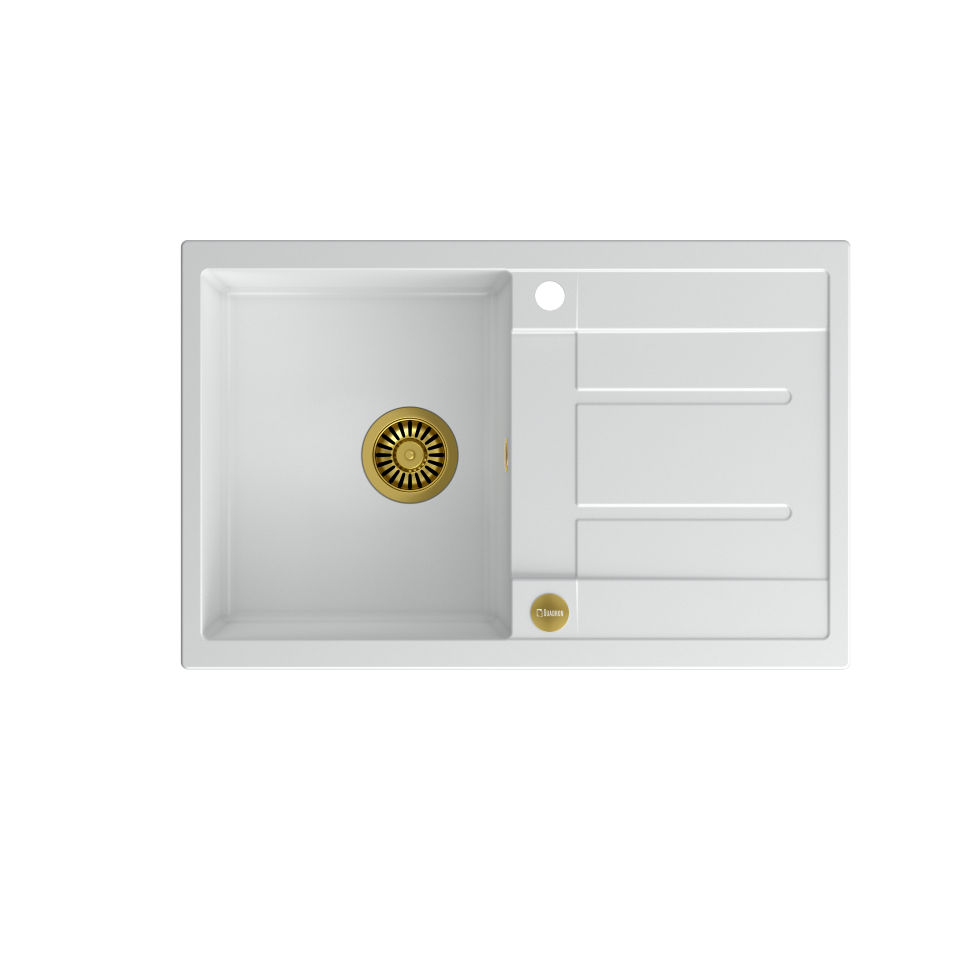 MORGAN 111 GraniteQ snow white/elementy złote Zlewozmywak wykonany z GraniteQ gwarantuje najwyższą higieniczność i trwałość . Nowoczesne wzornictwo – dostosowane do aktualnych trendów. GraniteQ – zapewnia dużą twardość, trwałość i higieniczność powierzchni Zlewozmywak odwracalny – komora może być zamontowana po prawej lub lewej stronie. Rozetka przelewu również wykonana jest ze stali szlachetnej SteelQ w technologii PVD w kolorze dopasowanym do koloru pozostałych elementów co jeszcze bardziej podkreśla jego urodę. Zlewozmywak wyposażony jest w odpływ ze stali szlachetnej SteelQ w technologii PVD w kolorze dopasowanym do pozostałych elementów co nadaje produktowi elegancki wygląd oraz w syfon z możliwością podłączenia zmywarki lub pralki Głębokie i pojemne komory zlewozmywaków Quadron to ich cecha wyróżniająca, która zapewnia duży komfort użytkowania. Łatwy montaż - w komplecie zaczepy mocujące Wersja Premium Głębokie komory zlewozmywaków Quadron to ich cecha wyróżniająca. Pojemna komora to przede wszystkim duży komfort użytkowania. Zmywanie dużych garnków czy blach nie stanowi problemu dzięki temu, że pojemność zlewozmywaka jest zwiększona o kilka litrów. Zlewozmywak wyposażony jest w odpływ ze stali szlachetnej SteelQ w technologii PVD w wybranym kolorze co nadaje mu elegancki wygląd. GraniteQ - wygląd & trwałość Produkty wykonane z GraniteQ zapewniają nowoczesny wygląd i długowieczność produktu. Są łatwe do utrzymania w czystości, odporne na wysokie temperatury (gorące garnki) oraz tak częste w kuchni nagłe jej zmiany (wrząca i zimna woda), odporne na działanie czynników chemicznych oraz wiele rodzajów osadów (np. po kawie czy herbacie). GraniteQ – wytrzymałość & higiena Materiał GraniteQ stworzony jest z drobnych cząsteczek granitu (75-80%) połączonych ze sobą za pomocą wysokiej jakości spoiwa (20-25%), dzięki czemu zlewozmywak charakteryzuje się wyjątkową wytrzymałością i odpornością. Zastosowanie bardzo drobnych cząsteczek granitu minimalizuje przestrzeń wypełnioną spoiwem, dzięki czemu udało się uzyskać zlewozmywak jedwabiście gładki i delikatny w dotyku, co również ma ogromne znaczenie podczas czyszczenia i konserwacji, ale przede wszystkim dla higieny i zachowania czystości. GraniteQ – metaliczny blask GraniteQ to nowoczesny materiał w opalizujących kolorach uzyskanych dzięki domieszce metalicznych drobinek. Nawet najbardziej wymagający użytkownicy będą usatysfakcjonowani gdy światło z oświetlenia umieszczonego nad blatem sprawi, iż kuchnia zabłyszczy delikatnym połyskiem swojej nowej biżuterii: zlewozmywaka marki Quadron. Efekt ten zostanie spotęgowany dzięki dodaniu baterii, odpływu i przelewu wykonanych ze stali szlachetnej SteelQ w technologii PVD w kolorach złota lub miedzi.