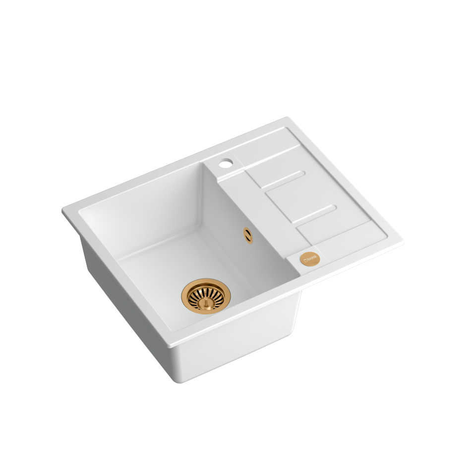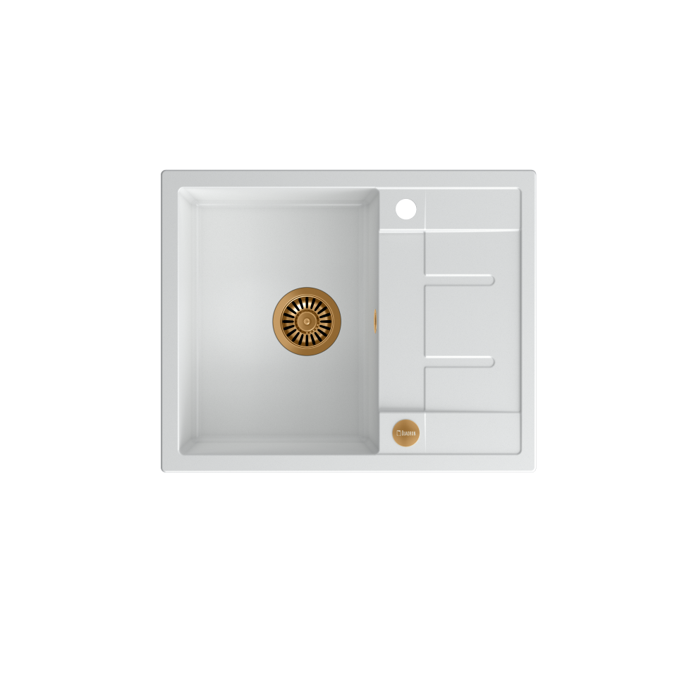 MORGAN 116 GraniteQ snow white/elementy miedziane Zlewozmywak wykonany z GraniteQ gwarantuje najwyższą higieniczność i trwałość . Nowoczesne wzornictwo – dostosowane do aktualnych trendów. GraniteQ – zapewnia dużą twardość, trwałość i higieniczność powierzchni Zlewozmywak odwracalny – komora może być zamontowana po prawej lub lewej stronie. Rozetka przelewu również wykonana jest ze stali szlachetnej SteelQ w technologii PVD w kolorze dopasowanym do koloru pozostałych elementów co jeszcze bardziej podkreśla jego urodę. Zlewozmywak wyposażony jest w odpływ ze stali szlachetnej SteelQ w technologii PVD w kolorze dopasowanym do pozostałych elementów co nadaje produktowi elegancki wygląd oraz w syfon z możliwością podłączenia zmywarki lub pralki Głębokie i pojemne komory zlewozmywaków Quadron to ich cecha wyróżniająca, która zapewnia duży komfort użytkowania. Łatwy montaż - w komplecie zaczepy mocujące Wersja Premium Głębokie komory zlewozmywaków Quadron to ich cecha wyróżniająca. Pojemna komora to przede wszystkim duży komfort użytkowania. Zmywanie dużych garnków czy blach nie stanowi problemu dzięki temu, że pojemność zlewozmywaka jest zwiększona o kilka litrów. Zlewozmywak wyposażony jest w odpływ ze stali szlachetnej SteelQ w technologii PVD w wybranym kolorze co nadaje mu elegancki wygląd. GraniteQ - wygląd & trwałość Produkty wykonane z GraniteQ zapewniają nowoczesny wygląd i długowieczność produktu. Są łatwe do utrzymania w czystości, odporne na wysokie temperatury (gorące garnki) oraz tak częste w kuchni nagłe jej zmiany (wrząca i zimna woda), odporne na działanie czynników chemicznych oraz wiele rodzajów osadów (np. po kawie czy herbacie). GraniteQ – wytrzymałość & higiena Materiał GraniteQ stworzony jest z drobnych cząsteczek granitu (75-80%) połączonych ze sobą za pomocą wysokiej jakości spoiwa (20-25%), dzięki czemu zlewozmywak charakteryzuje się wyjątkową wytrzymałością i odpornością. Zastosowanie bardzo drobnych cząsteczek granitu minimalizuje przestrzeń wypełnioną spoiwem, dzięki czemu udało się uzyskać zlewozmywak jedwabiście gładki i delikatny w dotyku, co również ma ogromne znaczenie podczas czyszczenia i konserwacji, ale przede wszystkim dla higieny i zachowania czystości. GraniteQ – metaliczny blask GraniteQ to nowoczesny materiał w opalizujących kolorach uzyskanych dzięki domieszce metalicznych drobinek. Nawet najbardziej wymagający użytkownicy będą usatysfakcjonowani gdy światło z oświetlenia umieszczonego nad blatem sprawi, iż kuchnia zabłyszczy delikatnym połyskiem swojej nowej biżuterii: zlewozmywaka marki Quadron. Efekt ten zostanie spotęgowany dzięki dodaniu baterii, odpływu i przelewu wykonanych ze stali szlachetnej SteelQ w technologii PVD w kolorach złota lub miedzi.