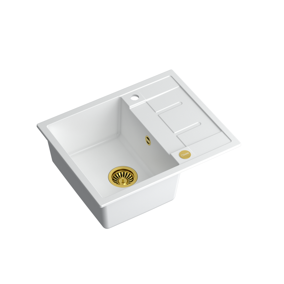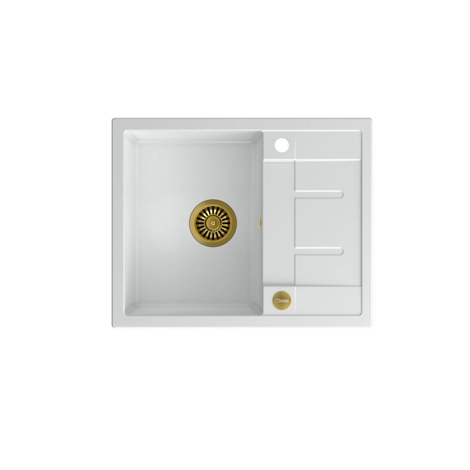 MORGAN 116 GraniteQ snow white/elementy złote Zlewozmywak wykonany z GraniteQ gwarantuje najwyższą higieniczność i trwałość . Nowoczesne wzornictwo – dostosowane do aktualnych trendów. GraniteQ – zapewnia dużą twardość, trwałość i higieniczność powierzchni Zlewozmywak odwracalny – komora może być zamontowana po prawej lub lewej stronie. Rozetka przelewu również wykonana jest ze stali szlachetnej SteelQ w technologii PVD w kolorze dopasowanym do koloru pozostałych elementów co jeszcze bardziej podkreśla jego urodę. Zlewozmywak wyposażony jest w odpływ ze stali szlachetnej SteelQ w technologii PVD w kolorze dopasowanym do pozostałych elementów co nadaje produktowi elegancki wygląd oraz w syfon z możliwością podłączenia zmywarki lub pralki Głębokie i pojemne komory zlewozmywaków Quadron to ich cecha wyróżniająca, która zapewnia duży komfort użytkowania. Łatwy montaż - w komplecie zaczepy mocujące Wersja Premium Głębokie komory zlewozmywaków Quadron to ich cecha wyróżniająca. Pojemna komora to przede wszystkim duży komfort użytkowania. Zmywanie dużych garnków czy blach nie stanowi problemu dzięki temu, że pojemność zlewozmywaka jest zwiększona o kilka litrów. Zlewozmywak wyposażony jest w odpływ ze stali szlachetnej SteelQ w technologii PVD w wybranym kolorze co nadaje mu elegancki wygląd. GraniteQ - wygląd & trwałość Produkty wykonane z GraniteQ zapewniają nowoczesny wygląd i długowieczność produktu. Są łatwe do utrzymania w czystości, odporne na wysokie temperatury (gorące garnki) oraz tak częste w kuchni nagłe jej zmiany (wrząca i zimna woda), odporne na działanie czynników chemicznych oraz wiele rodzajów osadów (np. po kawie czy herbacie). GraniteQ – wytrzymałość & higiena Materiał GraniteQ stworzony jest z drobnych cząsteczek granitu (75-80%) połączonych ze sobą za pomocą wysokiej jakości spoiwa (20-25%), dzięki czemu zlewozmywak charakteryzuje się wyjątkową wytrzymałością i odpornością. Zastosowanie bardzo drobnych cząsteczek granitu minimalizuje przestrzeń wypełnioną spoiwem, dzięki czemu udało się uzyskać zlewozmywak jedwabiście gładki i delikatny w dotyku, co również ma ogromne znaczenie podczas czyszczenia i konserwacji, ale przede wszystkim dla higieny i zachowania czystości. GraniteQ – metaliczny blask GraniteQ to nowoczesny materiał w opalizujących kolorach uzyskanych dzięki domieszce metalicznych drobinek. Nawet najbardziej wymagający użytkownicy będą usatysfakcjonowani gdy światło z oświetlenia umieszczonego nad blatem sprawi, iż kuchnia zabłyszczy delikatnym połyskiem swojej nowej biżuterii: zlewozmywaka marki Quadron. Efekt ten zostanie spotęgowany dzięki dodaniu baterii, odpływu i przelewu wykonanych ze stali szlachetnej SteelQ w technologii PVD w kolorach złota lub miedzi.