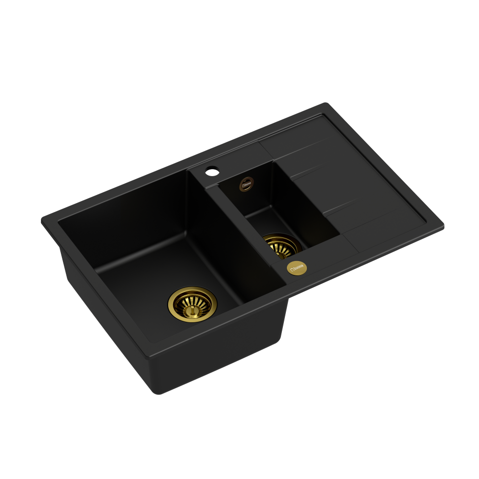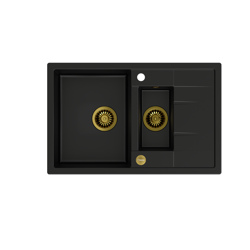 MORGAN 156 GraniteQ pure carbon/elementy złote Zlewozmywak wykonany z GraniteQ gwarantuje najwyższą higieniczność i trwałość . Nowoczesne wzornictwo – dostosowane do aktualnych trendów. GraniteQ – zapewnia dużą twardość, trwałość i higieniczność powierzchni Zlewozmywak odwracalny – komora może być zamontowana po prawej lub lewej stronie. Rozetka przelewu również wykonana jest ze stali szlachetnej SteelQ w technologii PVD w kolorze dopasowanym do koloru pozostałych elementów co jeszcze bardziej podkreśla jego urodę. Zlewozmywak wyposażony jest w odpływ ze stali szlachetnej SteelQ w technologii PVD w kolorze dopasowanym do pozostałych elementów co nadaje produktowi elegancki wygląd oraz w syfon z możliwością podłączenia zmywarki lub pralki Głębokie i pojemne komory zlewozmywaków Quadron to ich cecha wyróżniająca, która zapewnia duży komfort użytkowania. Łatwy montaż - w komplecie zaczepy mocujące Wersja Premium Głębokie komory zlewozmywaków Quadron to ich cecha wyróżniająca. Pojemna komora to przede wszystkim duży komfort użytkowania. Zmywanie dużych garnków czy blach nie stanowi problemu dzięki temu, że pojemność zlewozmywaka jest zwiększona o kilka litrów. Zlewozmywak wyposażony jest w odpływ ze stali szlachetnej SteelQ w technologii PVD w wybranym kolorze co nadaje mu elegancki wygląd. GraniteQ - wygląd & trwałość Produkty wykonane z GraniteQ zapewniają nowoczesny wygląd i długowieczność produktu. Są łatwe do utrzymania w czystości, odporne na wysokie temperatury (gorące garnki) oraz tak częste w kuchni nagłe jej zmiany (wrząca i zimna woda), odporne na działanie czynników chemicznych oraz wiele rodzajów osadów (np. po kawie czy herbacie). GraniteQ – wytrzymałość & higiena Materiał GraniteQ stworzony jest z drobnych cząsteczek granitu (75-80%) połączonych ze sobą za pomocą wysokiej jakości spoiwa (20-25%), dzięki czemu zlewozmywak charakteryzuje się wyjątkową wytrzymałością i odpornością. Zastosowanie bardzo drobnych cząsteczek granitu minimalizuje przestrzeń wypełnioną spoiwem, dzięki czemu udało się uzyskać zlewozmywak jedwabiście gładki i delikatny w dotyku, co również ma ogromne znaczenie podczas czyszczenia i konserwacji, ale przede wszystkim dla higieny i zachowania czystości. GraniteQ – metaliczny blask GraniteQ to nowoczesny materiał w opalizujących kolorach uzyskanych dzięki domieszce metalicznych drobinek. Nawet najbardziej wymagający użytkownicy będą usatysfakcjonowani gdy światło z oświetlenia umieszczonego nad blatem sprawi, iż kuchnia zabłyszczy delikatnym połyskiem swojej nowej biżuterii: zlewozmywaka marki Quadron. Efekt ten zostanie spotęgowany dzięki dodaniu baterii, odpływu i przelewu wykonanych ze stali szlachetnej SteelQ w technologii PVD w kolorach złota lub miedzi.
