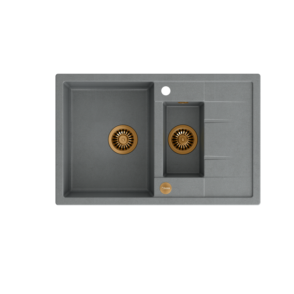 MORGAN 156 GraniteQ silver stone/elementy miedziane Zlewozmywak wykonany z GraniteQ gwarantuje najwyższą higieniczność i trwałość . Nowoczesne wzornictwo – dostosowane do aktualnych trendów. GraniteQ – zapewnia dużą twardość, trwałość i higieniczność powierzchni Zlewozmywak odwracalny – komora może być zamontowana po prawej lub lewej stronie. Rozetka przelewu również wykonana jest ze stali szlachetnej SteelQ w technologii PVD w kolorze dopasowanym do koloru pozostałych elementów co jeszcze bardziej podkreśla jego urodę. Zlewozmywak wyposażony jest w odpływ ze stali szlachetnej SteelQ w technologii PVD w kolorze dopasowanym do pozostałych elementów co nadaje produktowi elegancki wygląd oraz w syfon z możliwością podłączenia zmywarki lub pralki Głębokie i pojemne komory zlewozmywaków Quadron to ich cecha wyróżniająca, która zapewnia duży komfort użytkowania. Łatwy montaż - w komplecie zaczepy mocujące Wersja Premium Głębokie komory zlewozmywaków Quadron to ich cecha wyróżniająca. Pojemna komora to przede wszystkim duży komfort użytkowania. Zmywanie dużych garnków czy blach nie stanowi problemu dzięki temu, że pojemność zlewozmywaka jest zwiększona o kilka litrów. Zlewozmywak wyposażony jest w odpływ ze stali szlachetnej SteelQ w technologii PVD w wybranym kolorze co nadaje mu elegancki wygląd. GraniteQ - wygląd & trwałość Produkty wykonane z GraniteQ zapewniają nowoczesny wygląd i długowieczność produktu. Są łatwe do utrzymania w czystości, odporne na wysokie temperatury (gorące garnki) oraz tak częste w kuchni nagłe jej zmiany (wrząca i zimna woda), odporne na działanie czynników chemicznych oraz wiele rodzajów osadów (np. po kawie czy herbacie). GraniteQ – wytrzymałość & higiena Materiał GraniteQ stworzony jest z drobnych cząsteczek granitu (75-80%) połączonych ze sobą za pomocą wysokiej jakości spoiwa (20-25%), dzięki czemu zlewozmywak charakteryzuje się wyjątkową wytrzymałością i odpornością. Zastosowanie bardzo drobnych cząsteczek granitu minimalizuje przestrzeń wypełnioną spoiwem, dzięki czemu udało się uzyskać zlewozmywak jedwabiście gładki i delikatny w dotyku, co również ma ogromne znaczenie podczas czyszczenia i konserwacji, ale przede wszystkim dla higieny i zachowania czystości. GraniteQ – metaliczny blask GraniteQ to nowoczesny materiał w opalizujących kolorach uzyskanych dzięki domieszce metalicznych drobinek. Nawet najbardziej wymagający użytkownicy będą usatysfakcjonowani gdy światło z oświetlenia umieszczonego nad blatem sprawi, iż kuchnia zabłyszczy delikatnym połyskiem swojej nowej biżuterii: zlewozmywaka marki Quadron. Efekt ten zostanie spotęgowany dzięki dodaniu baterii, odpływu i przelewu wykonanych ze stali szlachetnej SteelQ w technologii PVD w kolorach złota lub miedzi.
