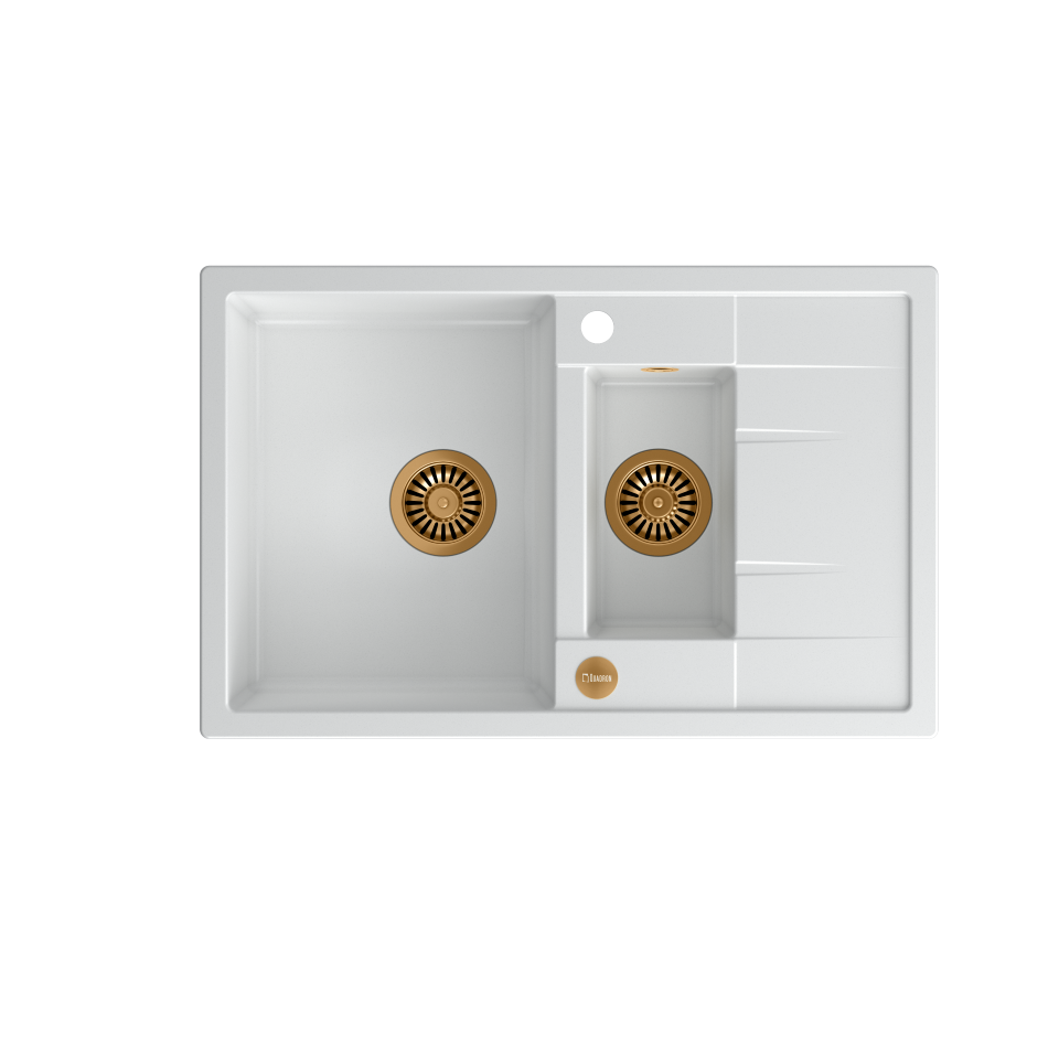 MORGAN 156 GraniteQ zlewozmywak snow white z syfonem Push To Open okrągły 1,5-komorowy z/o / elementy miedzianeMORGAN 156 GraniteQ zlewozmywak snow white z syfonem Push To Open okrągły 1,5-komorowy z/o / elementy miedziane