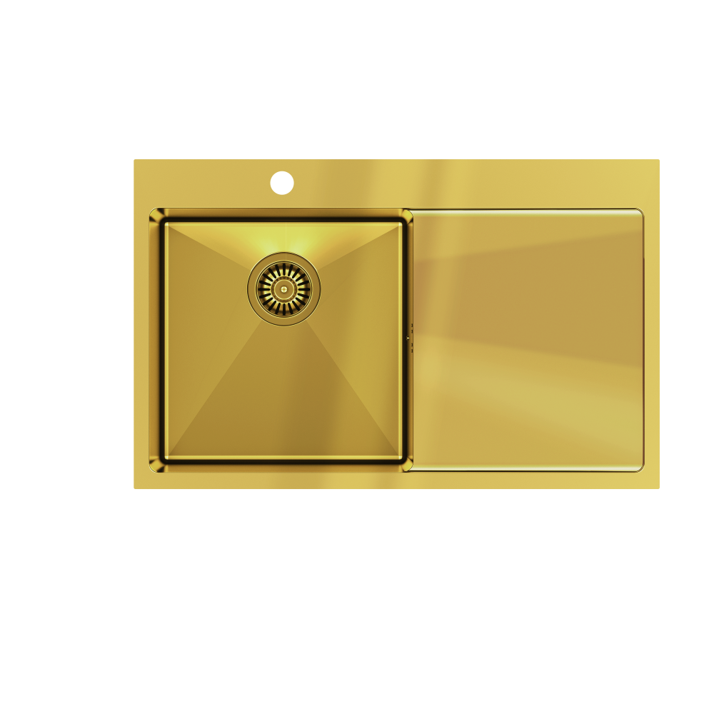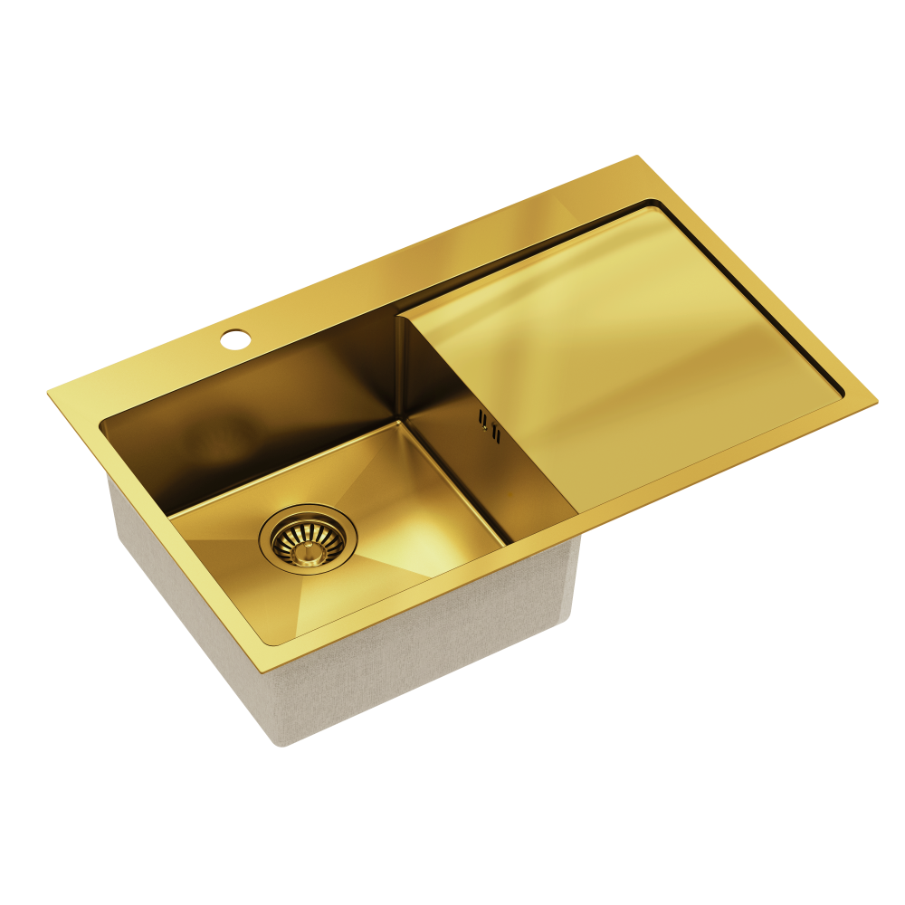 RUSSEL 111 SteelQ PVD złoty Zlewozmywak wykonany ze stali szlachetnej SteelQ o grubości 12 mm w technologii PVD co gwarantuje najwyższą higieniczność i trwałość . Promień narożników komory R 10, przetłoczenia w komorze i wąskie ranty nadają zlewozmywakowi nowoczesny i elegancki wygląd. Zlewozmywak wyposażony jest w odpływ ze stali szlachetnej SteelQ w technologii PVD w kolorze dopasowanym do koloru zlewozmywaka co nadaje produktowi elegancki wygląd. Głębokie i pojemne komory zlewozmywaków Quadron to ich cecha wyróżniająca, która zapewnia duży komfort użytkowania. W komplecie zaczepy mocujące, mata wygłuszająca i uszczelka, syfon z możliwością podłączenia zmywarki lub pralki Wersja Premium Głębokie komory zlewozmywaków Quadron to ich cecha wyróżniająca. Pojemna komora to przede wszystkim duży komfort użytkowania. Zmywanie dużych garnków czy blach nie stanowi problemu dzięki temu, że pojemność zlewozmywaka jest zwiększona o kilka litrów. Zlewozmywak wyposażony jest w odpływ ze stali szlachetnej SteelQ w technologii PVD w kolorze dopasowanym do koloru zlewozmywaka co nadaje produktowi elegancki wygląd. Wygląd & trwałość Produkty wykonane z wysokiej jakości stali szlachetnej SteelQ poddanej uszlachetnieniu w technologii PVD to nowoczesny wygląd i długowieczność użytkowania. Są łatwe do utrzymania w czystości, odporne na wysokie temperatury (gorące garnki) oraz tak częste w kuchni nagłe jej zmiany (wrząca i zimna woda), odporne na działanie czynników chemicznych oraz wiele rodzajów osadów (np. po kawie czy herbacie). Stal szlachetna SteelQ – niezwykły materiał Stal szlachetna SteelQ charakteryzuje się wyjątkowymi właściwościami. Stal szlachetna SteelQ to materiał, którego powierzchnia jest idealnie gładka (pozbawiona porów), dzięki czemu drobnoustroje i zanieczyszczenia nie przylegają do niej. Jest higieniczna i daje się łatwo wyczyścić. Kolejną cechą wyróżniającą stal szlachetną SteelQ jest odporność na wysoką temperaturę (np. gorące patelnie) czy tak częste w kuchni nagłe jej zmiany (np. gorący olej i zimna woda). Jest to materiał ekologiczny i po przetopieniu może zostać ponownie wykorzystany. Zdrowe & przyjazne dla środowiska Powierzchnia ze stali szlachetnej SteelQ dzięki technologii PVD została uszlachetniona głównie z myślą o higienie, tak aby chronić zdrowie naszych konsumentów i unikać rozwoju drobnoustrojów. Jednocześnie nasze produkty są tak zaprojektowane, aby resztki jedzenia lub brudu nie gromadziły się a czyszczenie było szybkie i efektywne – utrzymanie czystości to podstawa. Nasze zlewozmywaki stalowe SteelQ nadają się w 100 % do recyklingu - produkty przyjazne środowisku.