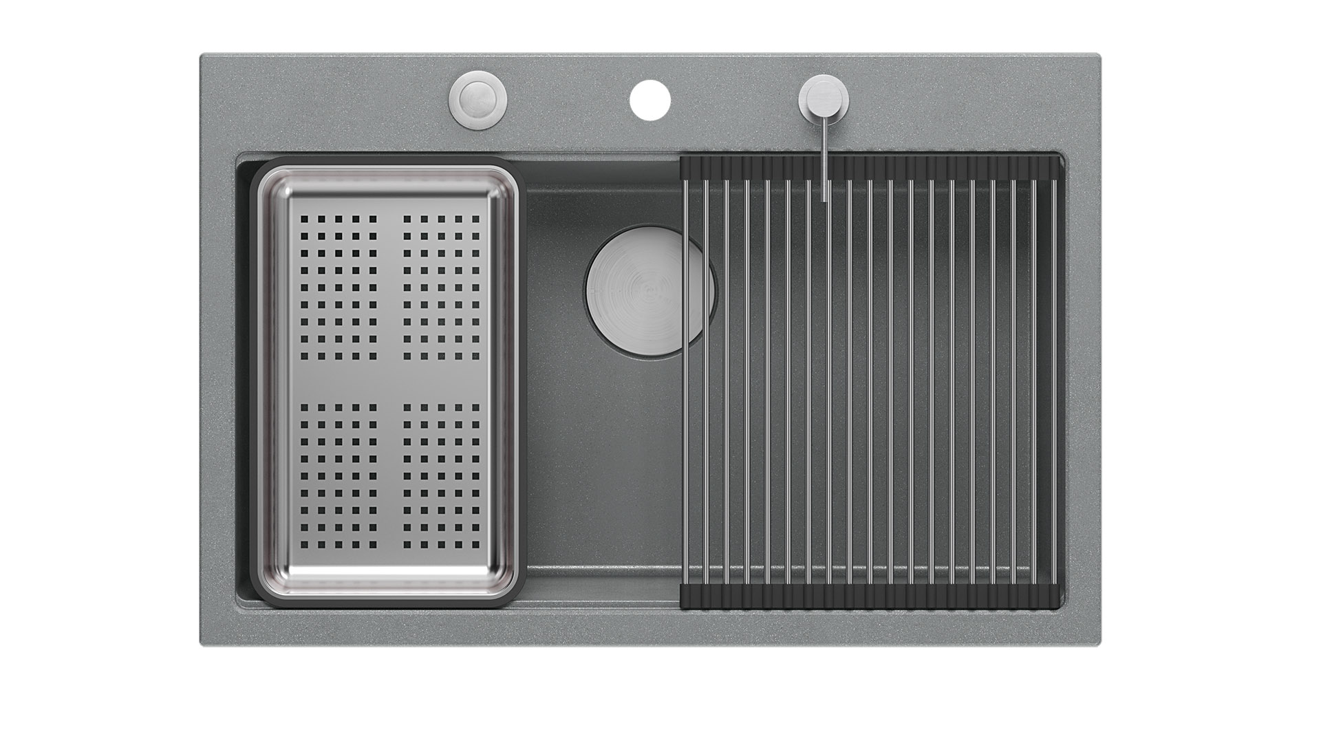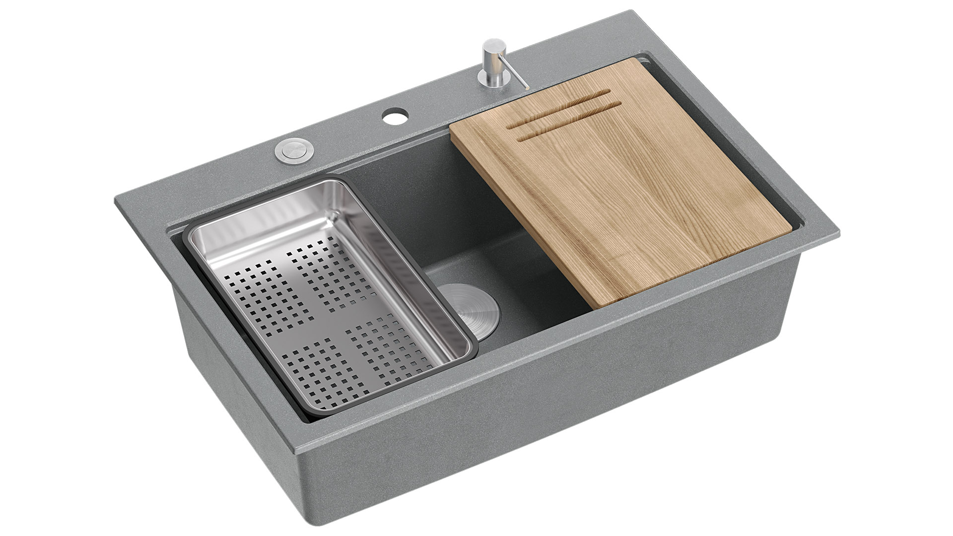 Zlewozmywak granitowy MARC Zlewozmywaki GraniteQ wytwarzane są z drobnych cząsteczek granitu (75-80% finalnego wyrobu) - połączonych ze sobą wysokiej jakości spoiwem - dzięki czemu charakteryzują się wyjątkową wytrzymałością oraz odpornością na zróżnicowane temperatury i charakter wykonywanych w ich obrębie prac. Dodatkowo GraniteQ dostępny jest również w opalizujących kolorach uzyskanych dzięki domieszce metalicznych drobinek. Nawet najbardziej wymagający użytkownicy będą usatysfakcjonowani, gdy oświetlenie nad blatem sprawi, iż kuchnia zabłyszczy delikatnym połyskiem swojej nowej „biżuterii”. Efekt ten może zostać spotęgowany dzięki akcesoriom ze stali szlachetnej, pokrytej w technologii PVD - w kolorach złota oraz miedzi. Zlewozmywaki granitowe marki Quadron są przyjemnie gładkie i delikatne w dotyku, co ma znaczenie również dla zachowania czystości i higieny. Marc Workstation GraniteQ - to kolekcja dla użytkowników oczekujących rozbudowanej funkcjonalności zlewozmywaka. W przypadku tego modelu, dzięki zastosowaniu bardzo dużej, 61 -litrowej komory, wygodnie opłuczemy i umyjemy nawet duże blachy z piekarnika! Wariant ze stalową armaturą , uzupełniony jest dodtkowo o trzy funkcjonalne akcesoria w tym samym kolorze ( Qmata , dozownik , wkładka ) oraz drewniana deska kuchenna. Natomiast zlewy z armaturą w powłoce PVD , w komplecie otrzymują jeden* dodatkowy element wyposażenia kuchennego ( dozownik ) oraz drewniana deska kuchenna Model MARC , przeznaczeny do intensywnego użytkowania, nie wyklucza eleganckiego i stylowego wyglądu! W skład zestawu wchodzi: zlewozmywak w kolorze black diamond - czarny granit z domieszką metalicznych drobinek 4 szt. zaczepów do zlewozmywaka wpuszczanego stalowa nakładka na odpływ ø 115 mm w kolorze stalowym dozownik na mydło/płyn o pojemności 350 ml w kolorze stalowym przyścienny odpływ Push-2-Open 3 1/2" z syfonem Save Space drewniana, jesionowa deska do krojenia o wymiarze 38 x 28 x 2 cm wielofunkcyjna Qmata w wymiarze 38 x 32 cm z silikonowym wykończeniem posiadająca 19 patyczków stalowa wkładka ociekowa o wymiarze 38 x 23 x 6 cm Zachęcamy do pobrania katalogu , w którym znajdą Państwo wszystkie nasze modele produktów w pełnej kolorystyce. *istnieje możliwość dokupienia pasującej do zlewozmywaka Marc Qmaty z powłoką PVD (złoto lub miedź)